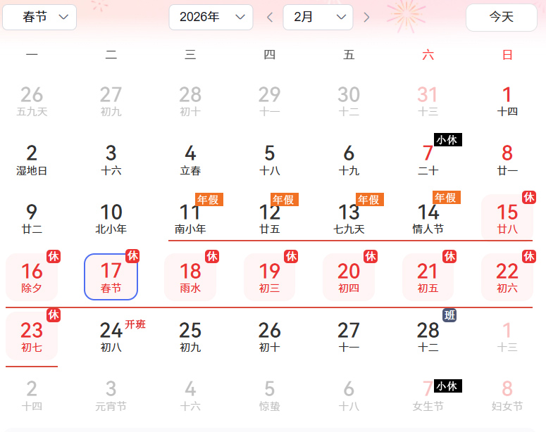 2026年2月11日(腊月廿四,周三)至2月23日(正月初七,周一),共计13天。2月24日(正月初八,周二)起全员返岗,请提前做好工作衔接(以下放假参考图)。